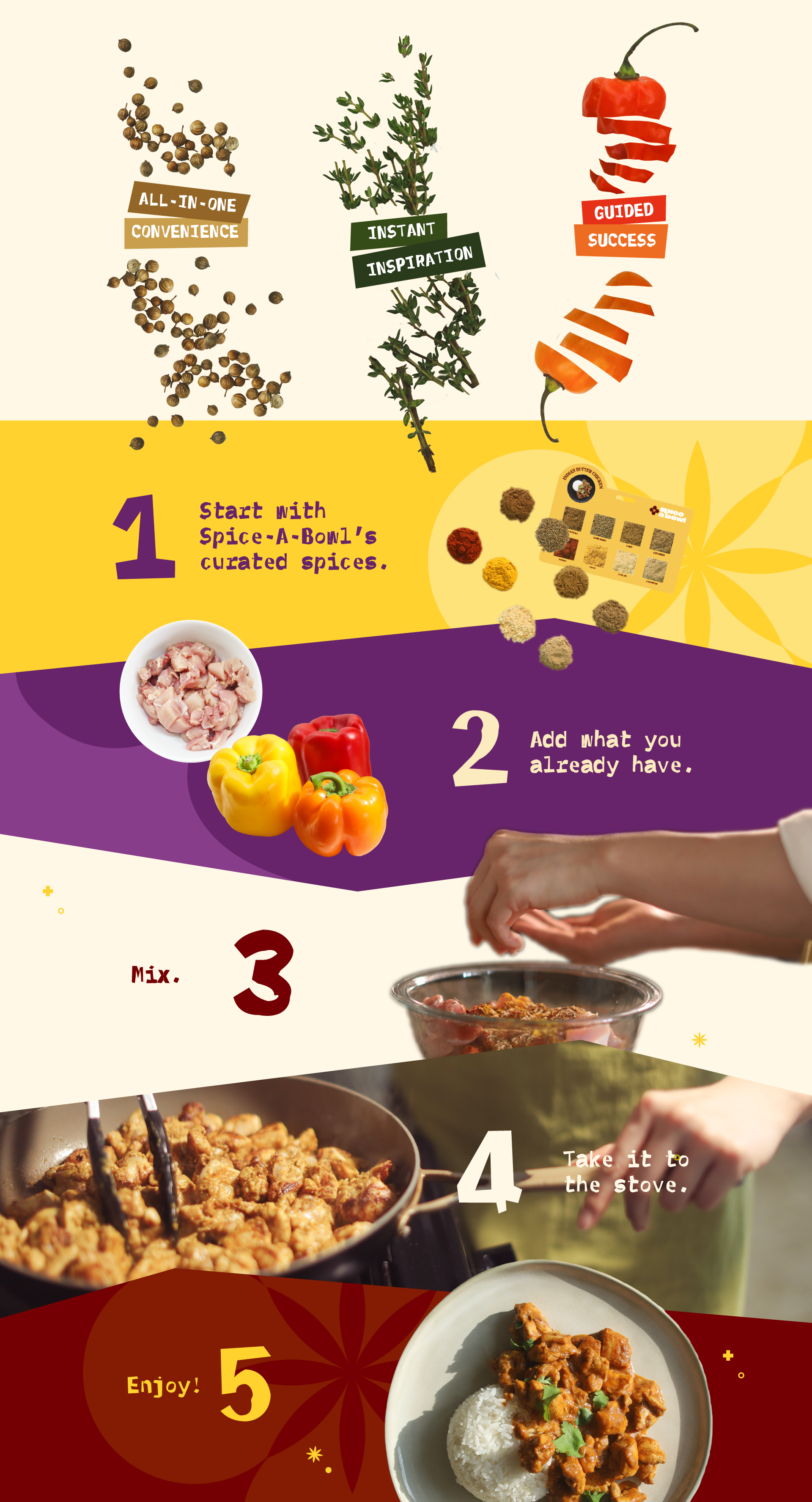 At Spice-A-Bowl, we believe that great food is important for the soul — flavorful, nourishing, and inspiring. With pre-portioned, easy-to-use packets of gourmet spices from diverse global cuisines, Spice-A-Bowl empowers you to cook and explore new flavors confidently with the least amount of hassle!